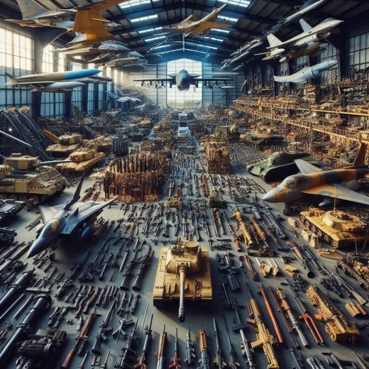 Illustration : Arcangelo Petrantò, 2024 – Armes rassemblées dans un immense hangar