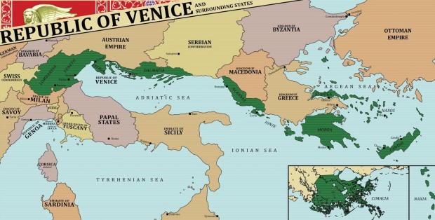 Illustration : Territoires ayant appartenu à la République de Venise au cours des siècles (en vert)